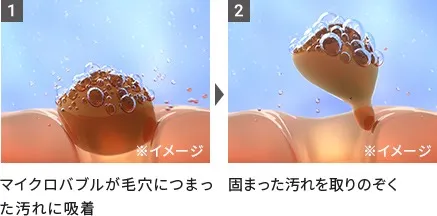 100μm未満のマイクロバブルは、毛穴につまった大きな汚れを浮かせて取りのぞくことができます。